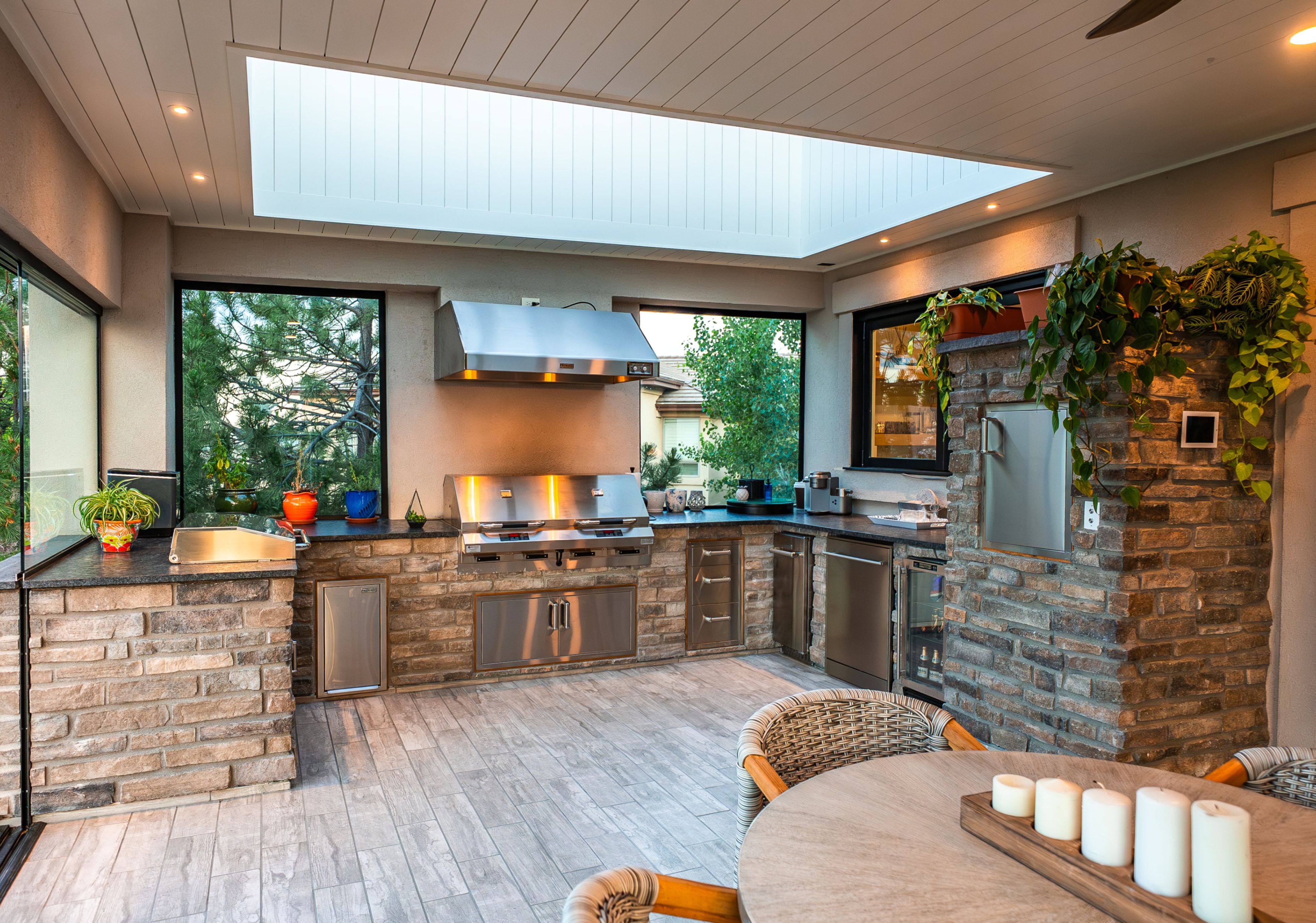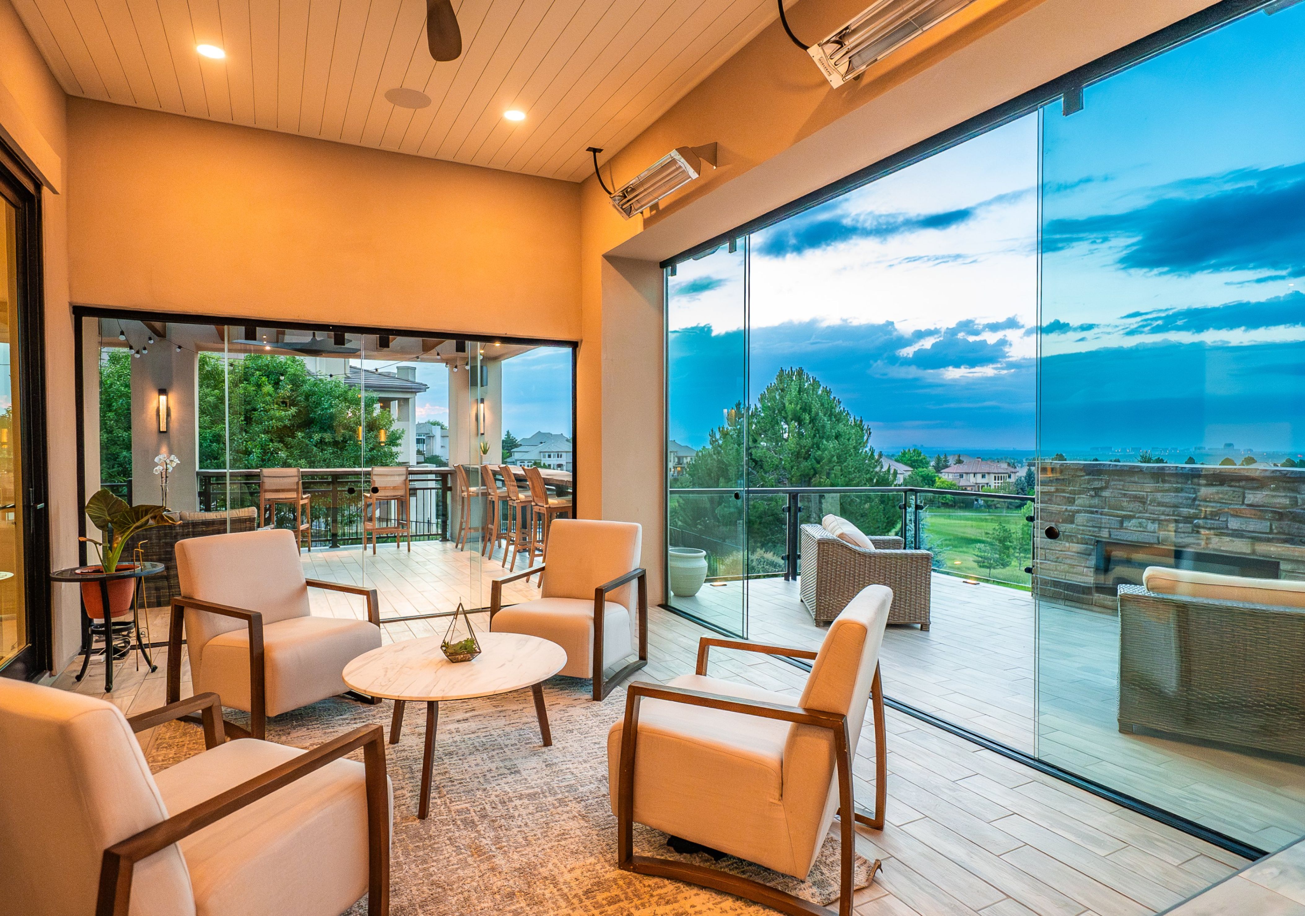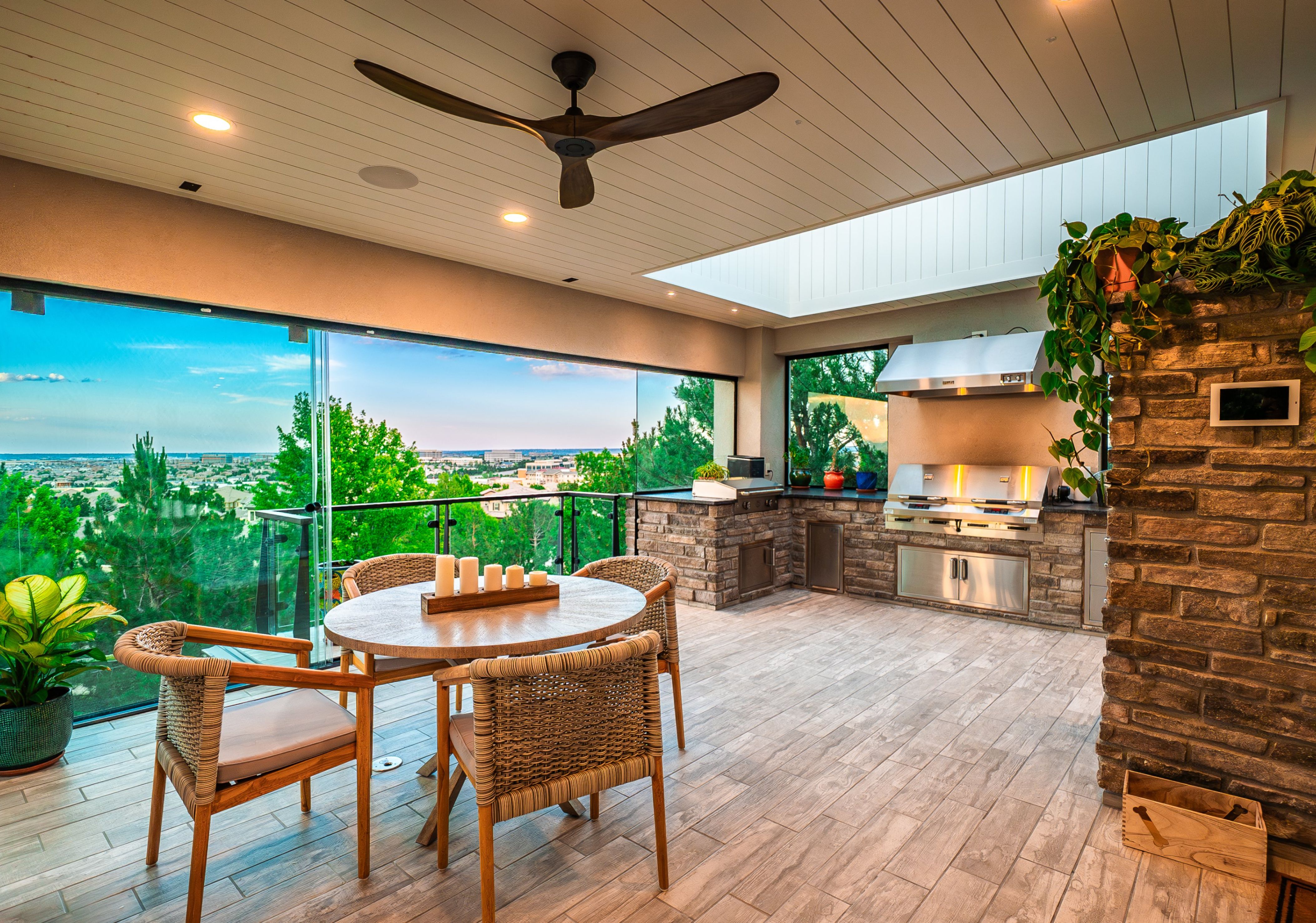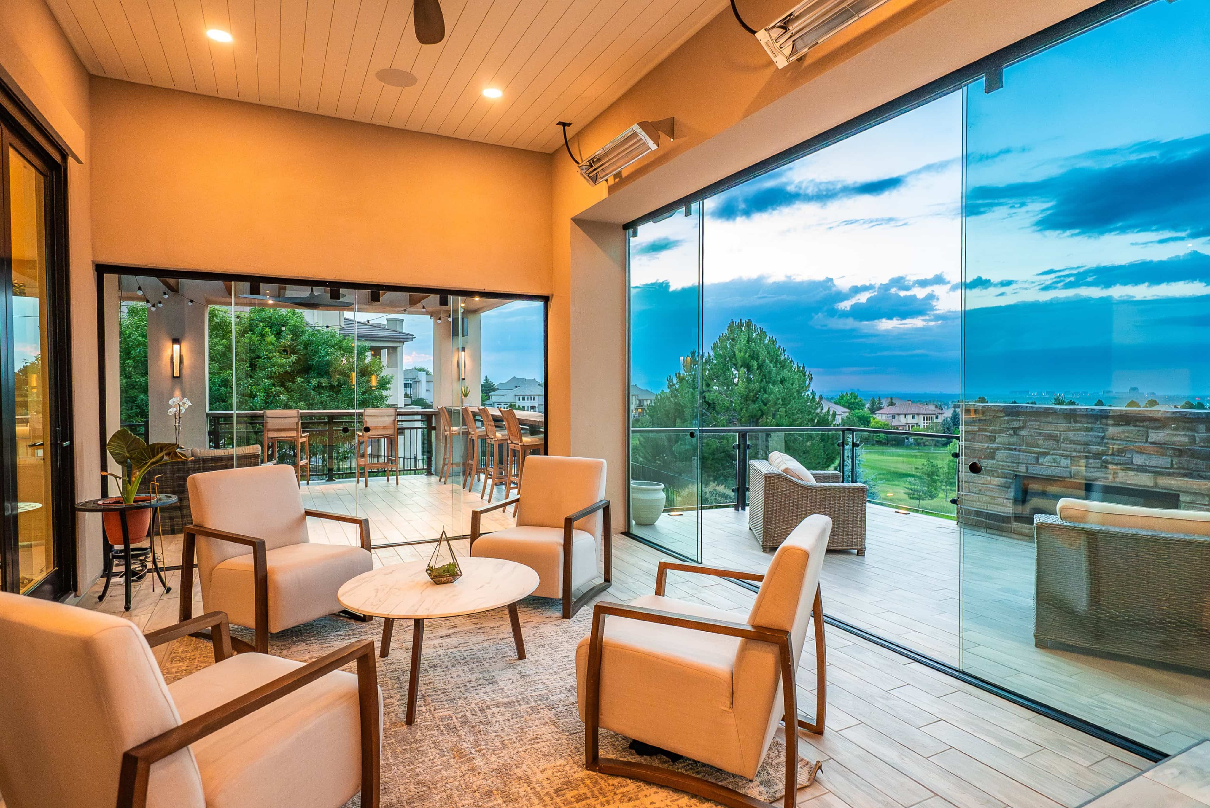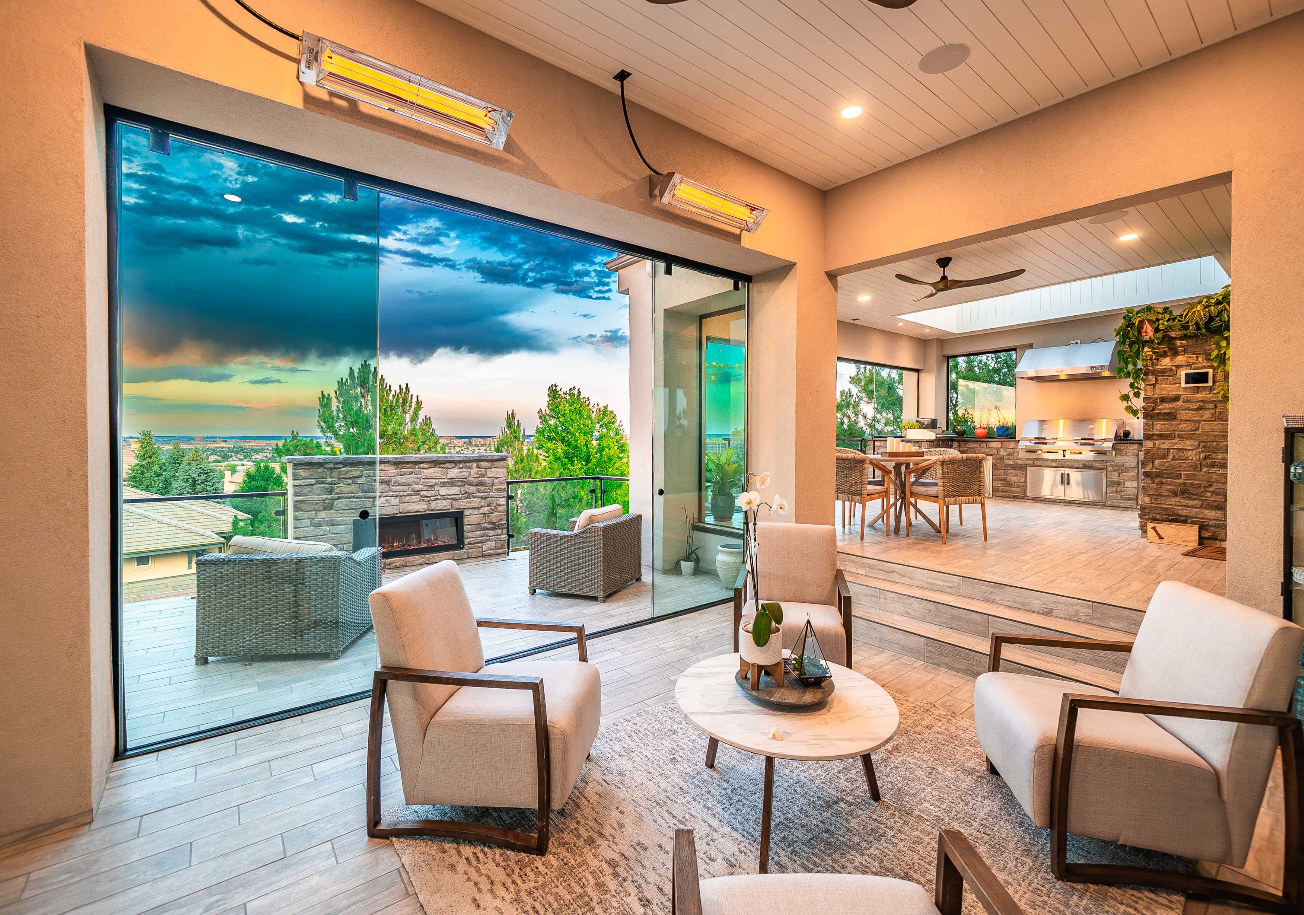 This stunning residence in Lone Tree, Colorado boasts beautiful mountain and city vistas. While the surroundings were nothing short of spectacular, the home was lacking in terms of outdoor enjoyment. The homeowner's goal was to remodel the inside kitchen, living room, and basement so all three spaces integrated with an entirely new Four Season Outdoor Living Space.