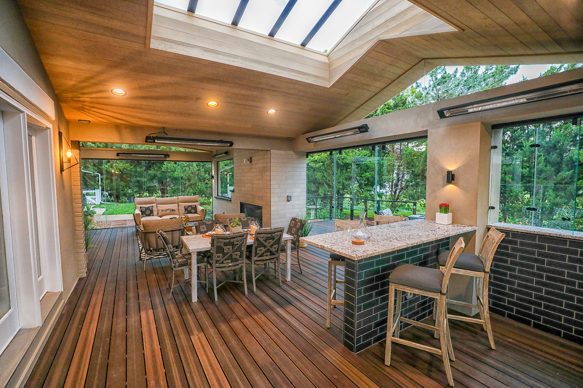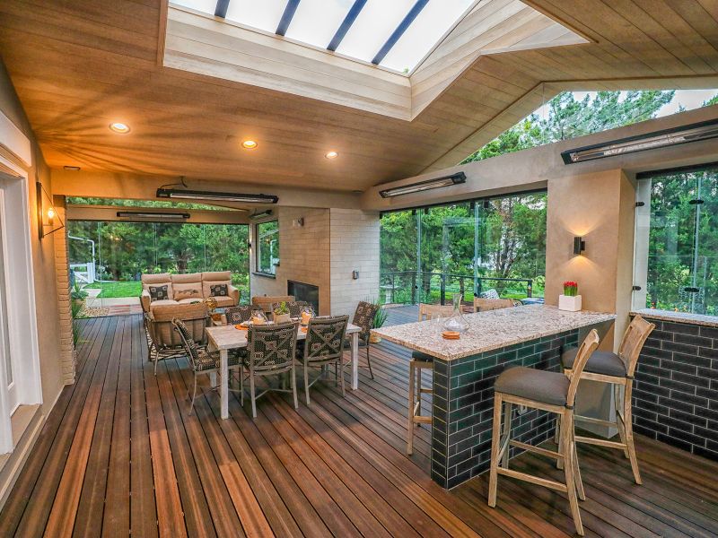 Deck We extend the roof line, and install the operable glass to enclose a deck space. Again, the glass can be entirely closed, or open to the outdoors.