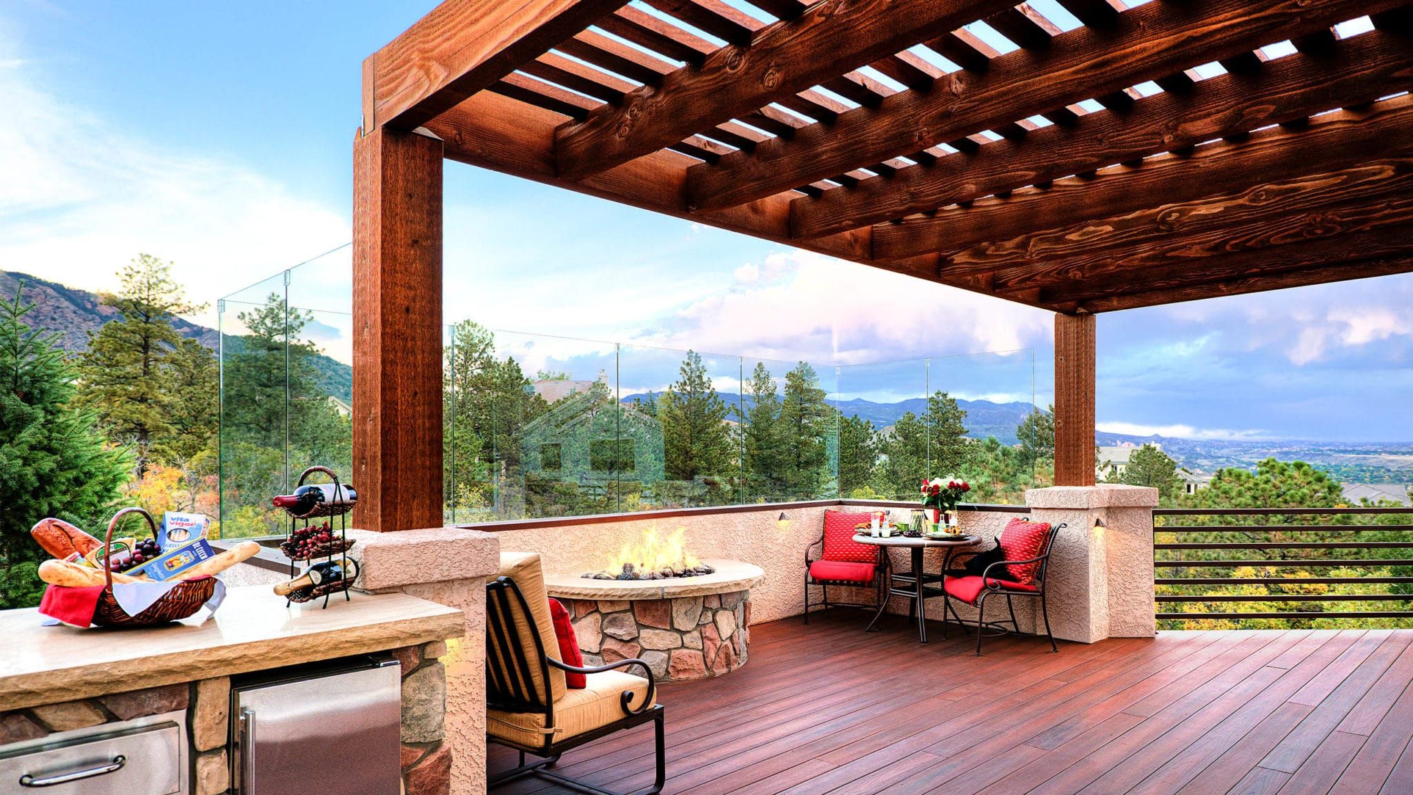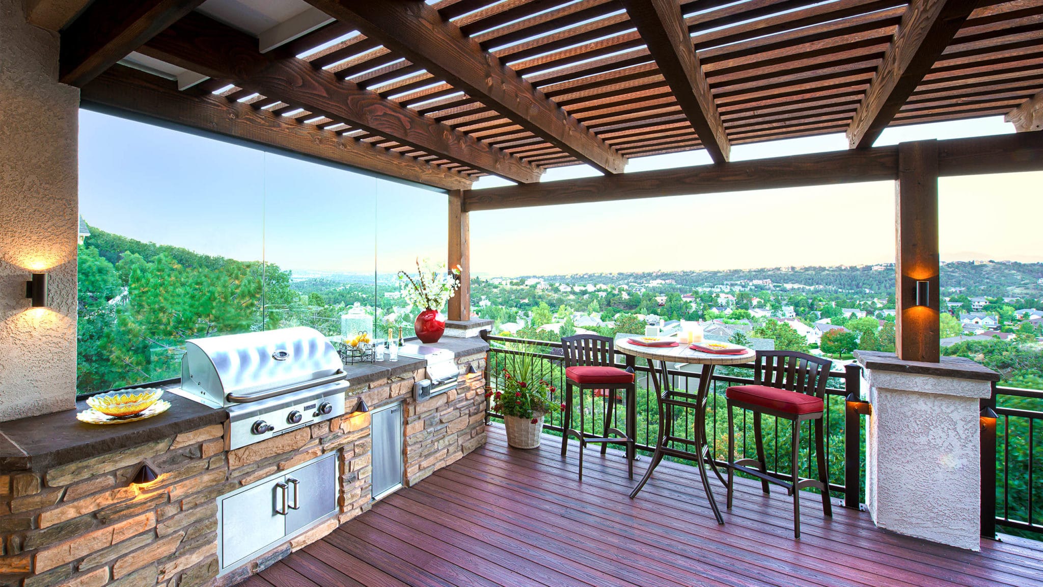 There are many things you can customize with a pergola for instance, we can design an open beam style pergola or modern pergolas that are flush. While there are many styles you can even customize them even more with glass wind walls that allow protection from Colorados harsh winds. To maintain an open feel there are also options to add custom steel privacy screens and walls to help provide more privacy.